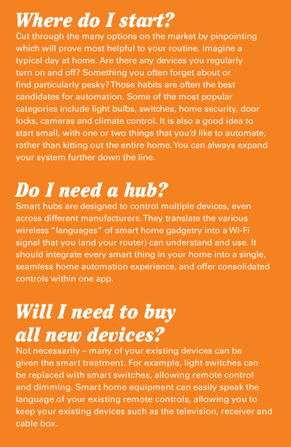 Home automation has developed beyond simple lamp timers, programmable thermostats and so on, towards networked household systems that learn your routine and automatically adjust to enhance it, controlled via an app anywhere, anytime. Think: smart beds that track your sleep patterns to ensure optimal rest, robotic vacuum cleaners you can kick-start at any moment, a front door you unlock remotely to let in a delivery, and sprinklers that analyze weather reports to decide when to water the garden.