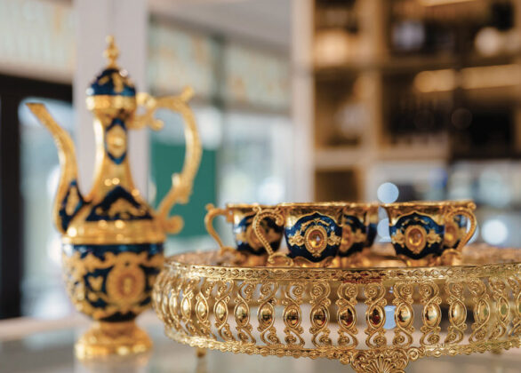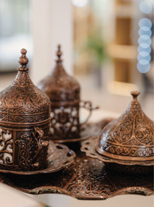 Fitting for a restaurant offering Mediterranean cuisine, the interior design uses regional influences through its material choices, colour palettes, shapes and architectural features such as intricate columns and ceiling details.