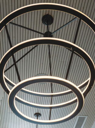 Above, the ceiling panelling is specifically designed not only for aesthetic purposes but also to serve a functional role by effectively absorbing sound, enhancing the overall look of the space.