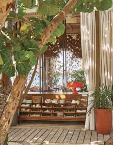 Natural fibre feature shades, and the thatch roof of the bar, draw the eye upwards, while hanging shell décor trails towards the floor, and tropical curios adorn the host’s table at the entryway.