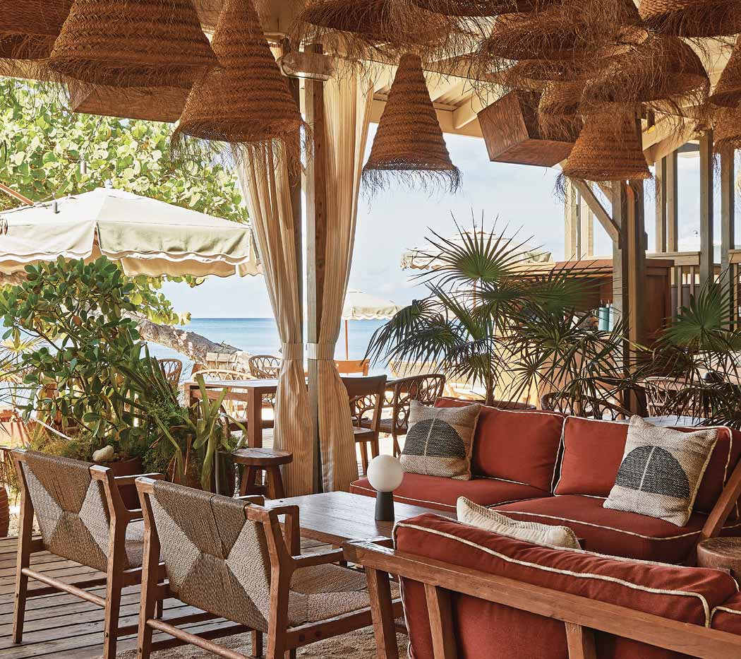 Guests enter the premises under the boughs of sea grape trees, with the pathway leading up to reveal the open restaurant and views of the Caribbean Sea beyond.