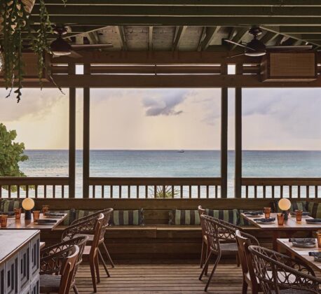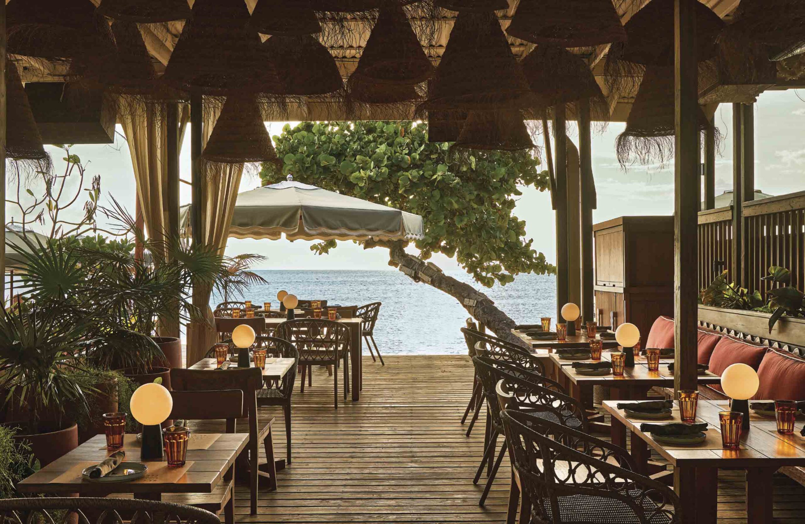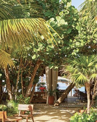 Guests enter the premises under the boughs of sea grape trees, with the pathway leading up to reveal the open restaurant and views of the Caribbean Sea beyond.