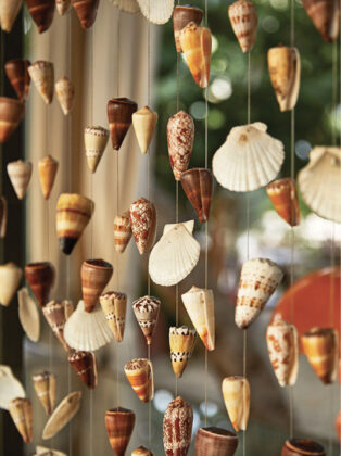 Natural fibre feature shades, and the thatch roof of the bar, draw the eye upwards, while hanging shell décor trails towards the floor, and tropical curios adorn the host’s table at the entryway.