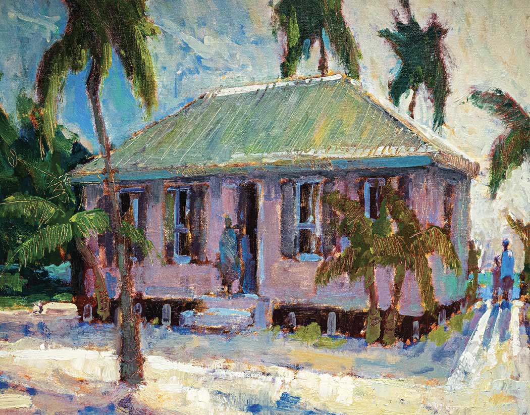 A nostalgic feel runs through Scott’s oil paintings – from thatch roofed cottages perched by the sea, schooners and catboats cutting through breezy waters and locals relaxing on a sandy beach under the shade of a grape tree.